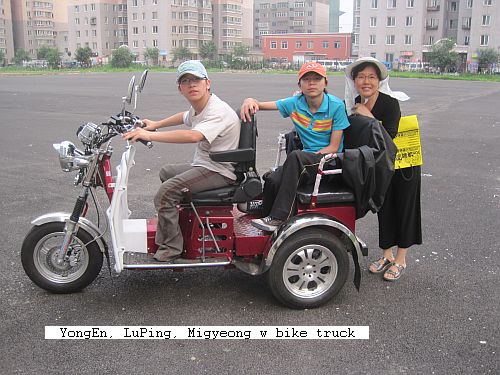 Two of our school boys, LiangLiang and LuPing have completed middle school and will be moving along to trade schools in September, LiangLiang to learn to be an accountant and LuPing to learn the design and tailoring business. The third boy, YongEn (aka DaPing or Sam) will be continuing his education in the middle school because he got a late start due to being confined to a wheelchair. He has received wonderful help in achieving independence from the kind folks at Bombardier who donated the funds to purchase what we are calling a “bike truck”. This vehicle is driven completely by hand controls so his club feet are not a problem any more! He and his buddy, LuPing, have been practicing with it most of the summer and he is ready to mosey to school the first part of September without the assistance of Wu Laoshi, his house parent! LiangLiang will be staying in a dormitory at his new school and LuPing will be able to walk to his new school and continue to stay with YongEn and Wu Laoshi.