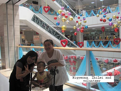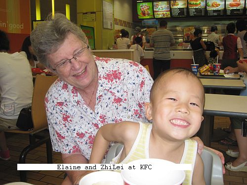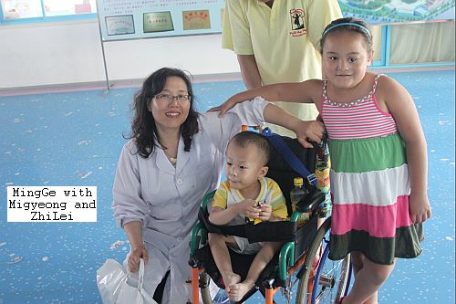 Fortunately, there was plenty going on during that time to take my mind off my computer problems. One wonderful gift was a visit by John Daley and his Chinese/American daughter, MingGe! They drifted into Shenyang during the first full week in July and were around until the end of the month affording us with many hours of joy while visiting with them! While visiting the orphanage, MingGe made the acquaintance of ZhiLei, the precious four year old whose only problem is having fragile bones. He is the bright and shining star of our group and, unfortunately, has virtually no one of his mental level to play with. He took to MingGe right away and constantly asked for her to return and play with him which she did while spending several days with Migyeong and me. After John and MingGe returned to the States, we took advantage of having a volunteer to help and took ZhiLei for his first outing: to a nearby KFC and shopping mall! He is totally smitten and can’t wait to go back!