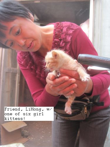 Rounding out the pictures that accompany this newsletter are some from life around where we live. LiHong, our friend in the night market shows us one of her new kitties. There are five of them and ALL females! What are the odds of that? Anyway, three have gone to good homes and two are living in their shop, probably eventually to keep any nasty mice away from their stock of sunflower seeds, etc.
