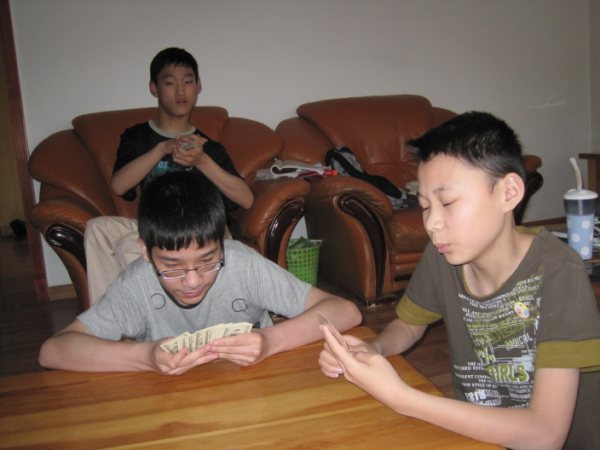 LiangLiang, LuPing and Sam are still with their noses in their school books most of the time. A Chinese friend dropped by to share some chicken wings and some other food with them and helped me teach them some of the rudiments of “spades”, a game I’ve always enjoyed. I’m hoping that it will teach them some sense of strategy as well as some “number sense” as we continue to come together occasionally to play.