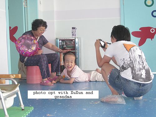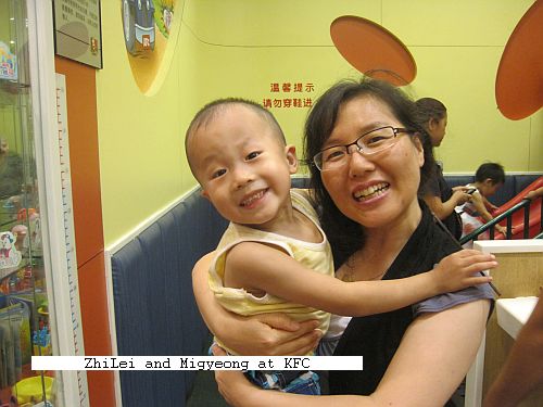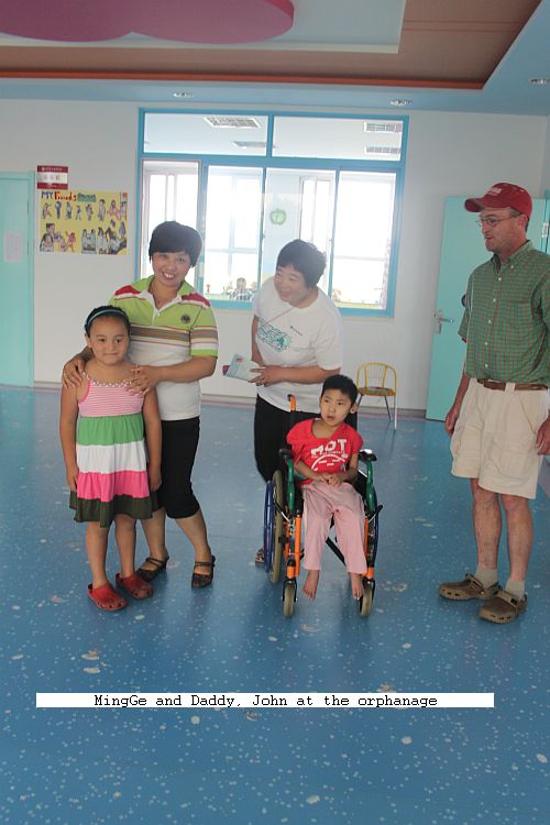 Fortunately, there was plenty going on during that time to take my mind off my computer problems. One wonderful gift was a visit by John Daley and his Chinese/American daughter, MingGe! They drifted into Shenyang during the first full week in July and were around until the end of the month affording us with many hours of joy while visiting with them! While visiting the orphanage, MingGe made the acquaintance of ZhiLei, the precious four year old whose only problem is having fragile bones. He is the bright and shining star of our group and, unfortunately, has virtually no one of his mental level to play with. He took to MingGe right away and constantly asked for her to return and play with him which she did while spending several days with Migyeong and me. After John and MingGe returned to the States, we took advantage of having a volunteer to help and took ZhiLei for his first outing: to a nearby KFC and shopping mall! He is totally smitten and can’t wait to go back!