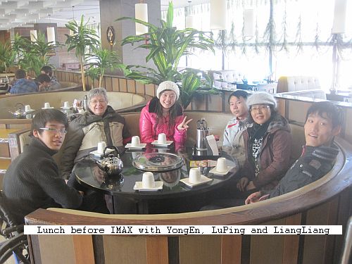 Since the three boys were off for winter vacation until the end of February, we wanted to do something special with them. My young friend, Rainbow, was happy to aid and abet so we planned to take them to a showing at the IMAX: the new Tom Cruise flick “Mission Impossible: the something protocol”. We made the date and I even drove down to the shopping center where the film was being shown so I wouldn’t get lost on THE day. This was a case of “the best laid plans of mice and men often go astray…”. The boys were to meet us at the van so we were surprised to find LiangLiang knocking at our apartment door: the elevator was not working and he’d walked up ten flights to let us know! What a guy! We gathered our stuff and walked down to the van only to find that the van was totally DEAD! I had just bought some jumper cables so I hoped and prayed that they would do the trick BUT more complications: it was TOO dead for a successful jump so on to Plan B. LuPing was the navigator for the trip so he had the instructions about how to get there so he went in the taxi with Migyeong and the other boys. I was left on my own but I’d already been there so I was ok. We made it just fine and even found our friends, Rainbow and another young Chinese fellow. We located the IMAX and bought the tickets and then went to have lunch. Korean food seemed satisfactory to all so that’s where we went.