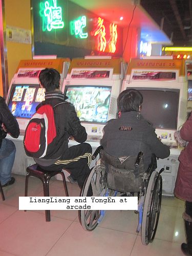 After the movie, we decided to look around the mall a little and happened to find a huge electronic game arcade! This appealed to our boys as well as the young Chinese so we indulged ourselves for quite a while with the young Chinese providing the boys with all the tokens they could use! It was fun for the boys that are so limited in what they can do physically to actually sit astride real looking (and acting) motor bikes and cars as the motion on the screens in front of them led them on very realistic chases of all sorts! After a while, we were able to disengage them and get them back in taxis for the ride back home. It had been an exciting day, overall, and I’m sure we all slept very well that night. I know I did!