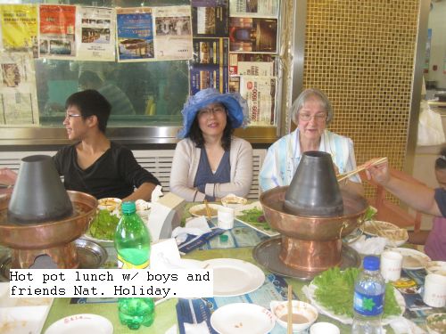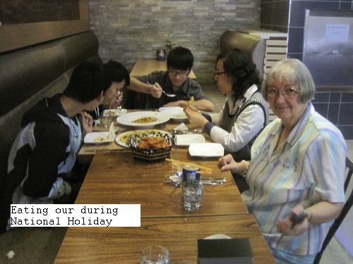 October 1 is the date that the birth of “New China” is celebrated for a whole week! We did our part by having several meals at various restaurants with our three boys along with various friends, theirs and ours. Migyeong and I were also invited next door to have dinner with the “raven”, her husband and her brother who was visiting from BeiJing. The friendship formed between her and Migyeong (and me since everybody needs an old foreigner in their life!) has continued and blossomed to include cookie baking (us in charge) and tackling a pumpkin (all the “raven”’s doings).