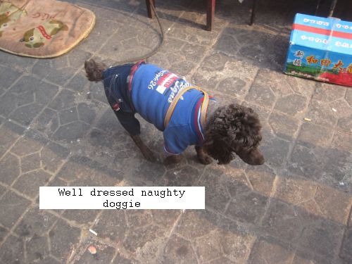 I included a couple of dog pics and one of one of the many Chinese cabbage trucks to go along with the pic of stacked up cabbage from last month. The difference between a good dog and a naughty one is to be judged by their treatment of ME! The “good” dog was sweet and let me pet her while the “naughty” one not only barked at me but had the nerve to lift his leg and anoint my white sneakers! Now, that’s NAUGHTY!